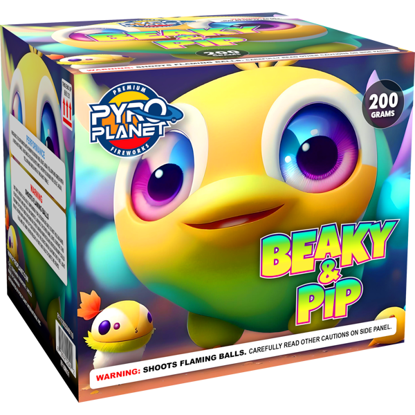 Introducing “Beaky & Pip,” a charming fountain to brighten any celebration! Enjoy chrysanthemum and crackle effects in shimmering gold, silver, red, blue, and green. A magical duo that brings whimsy, wonder, and a splash of joy to your festivities.