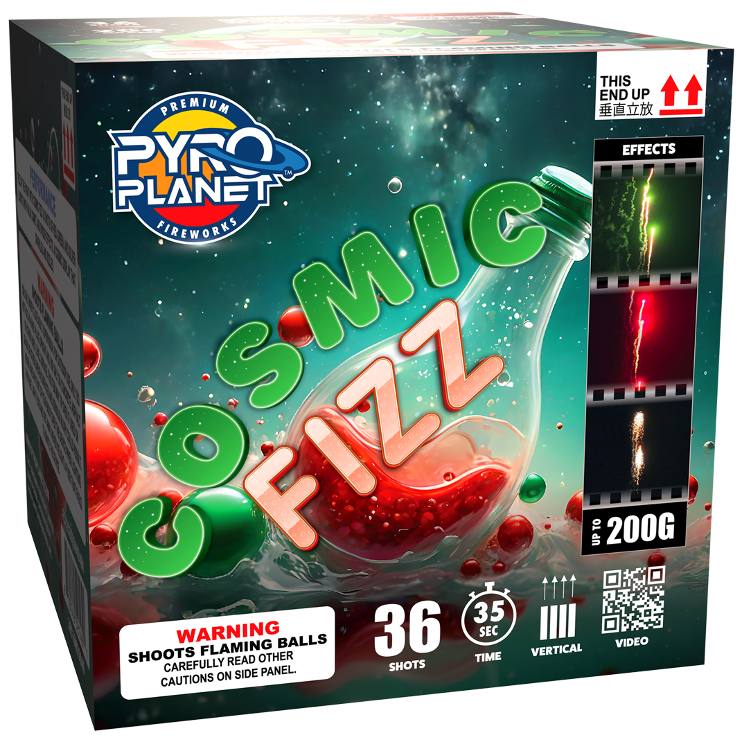 Fizz up the night with Cosmic Fizz! 36 shots of Red, Green, and Silver bursts with Palm, Comet, and Spider effects. A cosmic display that sparkles and sizzles.