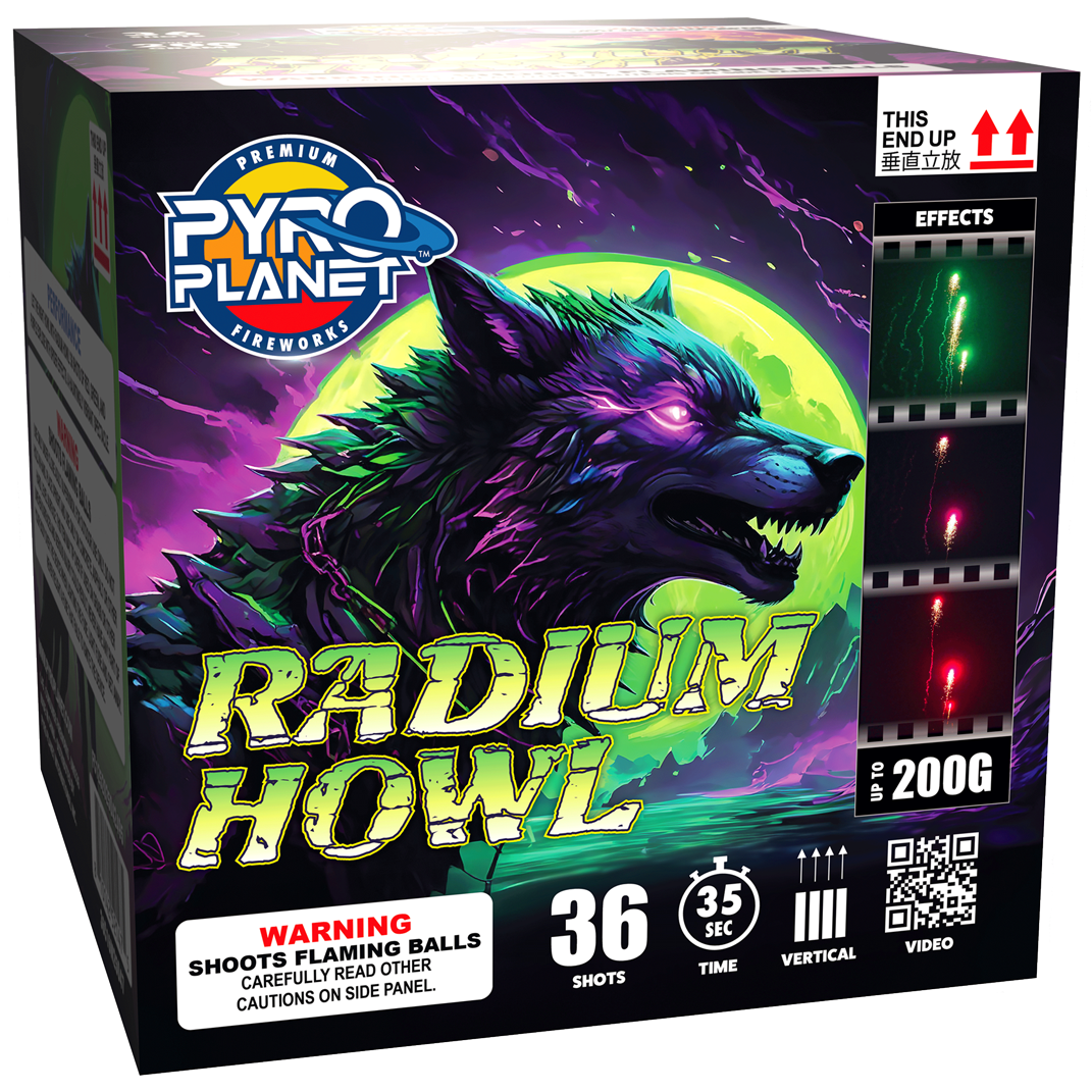 Let the night howl with Radium Howl! 36 shots of Red, Green, and Purple explode with Spider effects. A hauntingly vibrant spectacle.