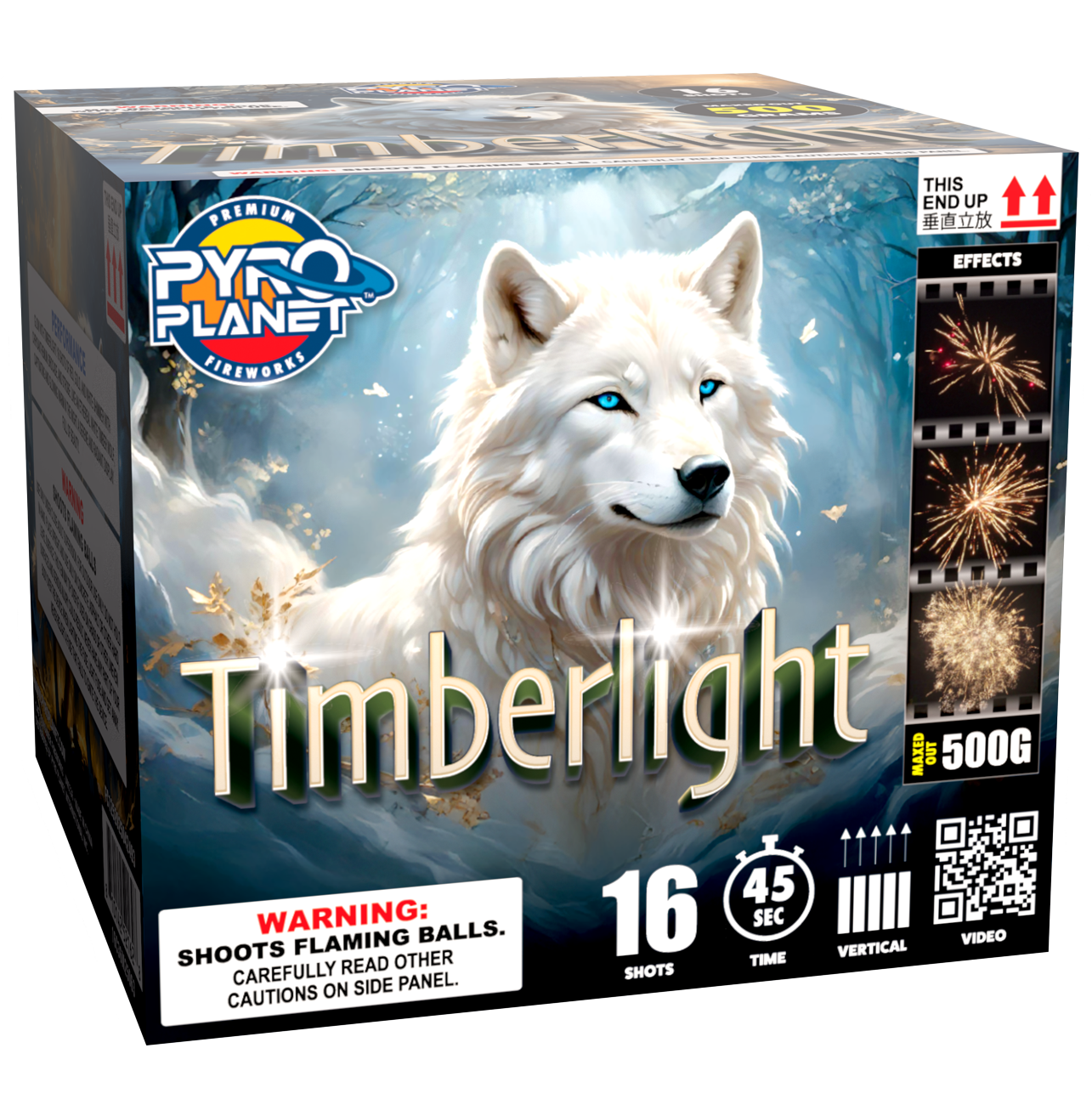 Glow with Timberlight! 16 shots of Red, Gold, and White shimmer with Chrysanthemum, Brocade, and Strobe. Like an ethereal white timber wolf, captivating and glowing warm in the night. A serene and radiant display full of beauty.